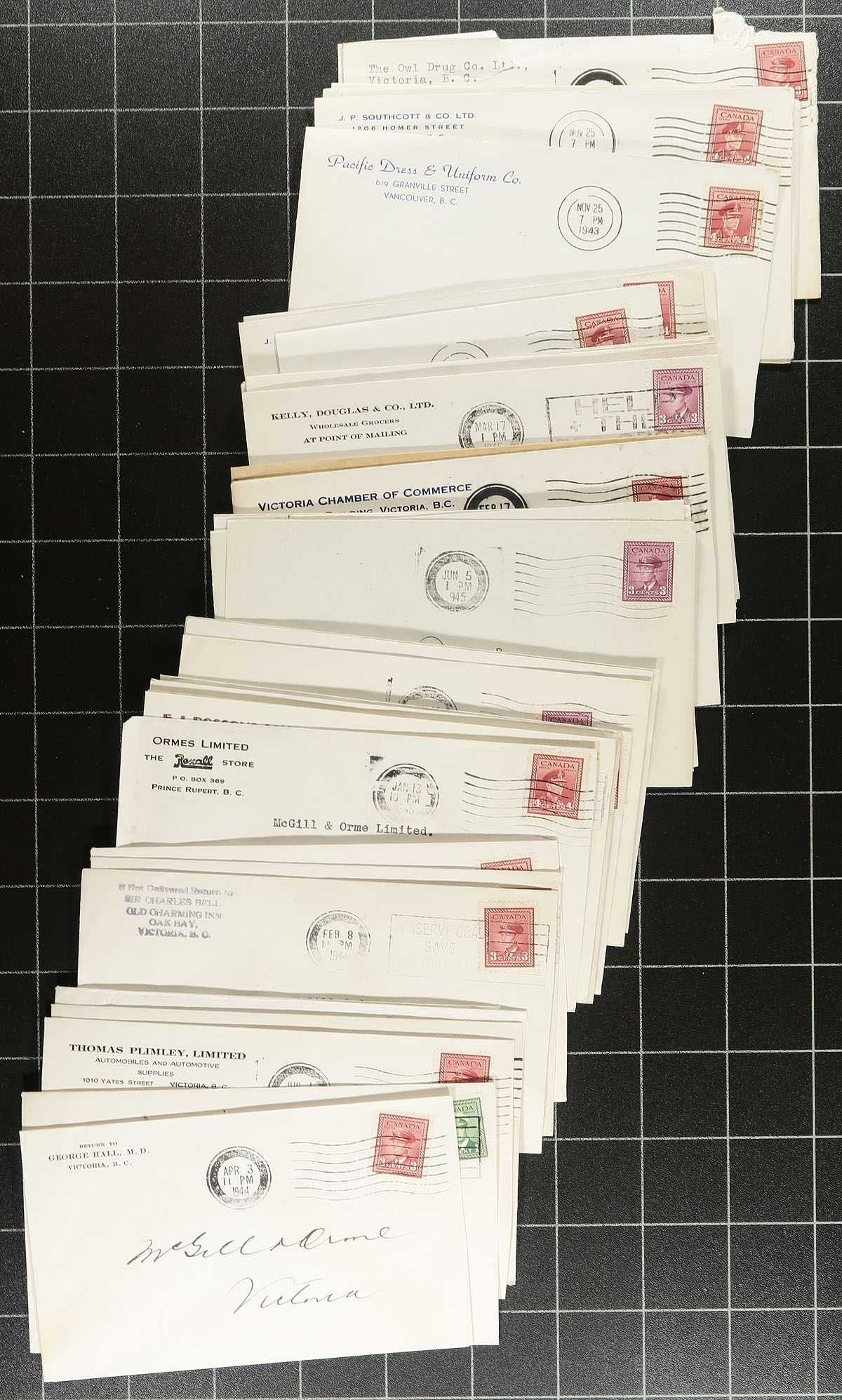 British Columbia WWII Blackout Cancels. An original correspondence hoard of over 300 covers, plus several pieces all bearing 1944/1945 dated WWII blackout postmarks from Victoria BC. All addressed to the McGill & Orme Drugstore in Victoria. Includes an array of both "wavy line" as well as multiple slogan types. A great lot for study of dates and usages in a finite period. Estimate =