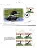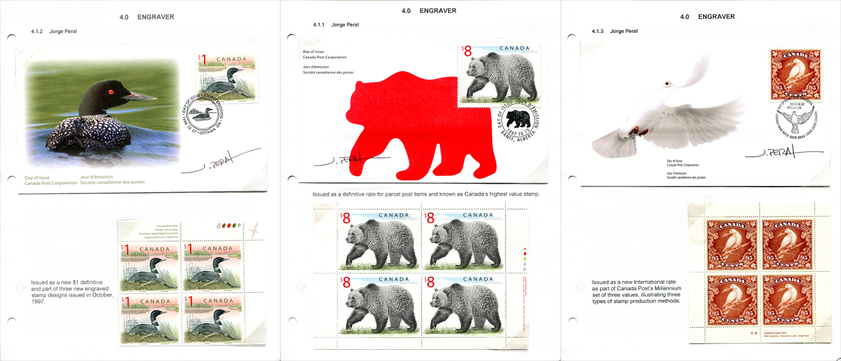 Stamp Engraver SIGNED First Day Cover Trio, plus stamps. Three collector album pages, featuring the 1998 issued $1.00 Loon, 1997 issued $8.00 Grizzly and 1999 issued 95c Millenium Dove. Each page features a FDC signed by removed stamp engraver Jorge Peral, plus mint Never Hinged blocks of four of each issue. Some of Canada's most beautiful "modern" issues. Estimate =