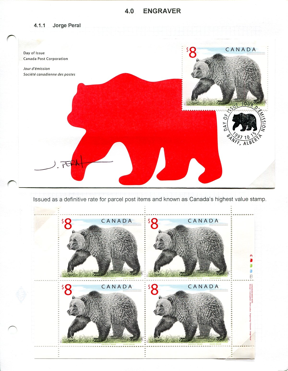 Stamp Engraver SIGNED First Day Cover Trio, plus stamps. Three collector album pages, featuring the 1998 issued $1.00 Loon, 1997 issued $8.00 Grizzly and 1999 issued 95c Millenium Dove. Each page features a FDC signed by removed stamp engraver Jorge Peral, plus mint Never Hinged blocks of four of each issue. Some of Canada's most beautiful "modern" issues. Estimate =