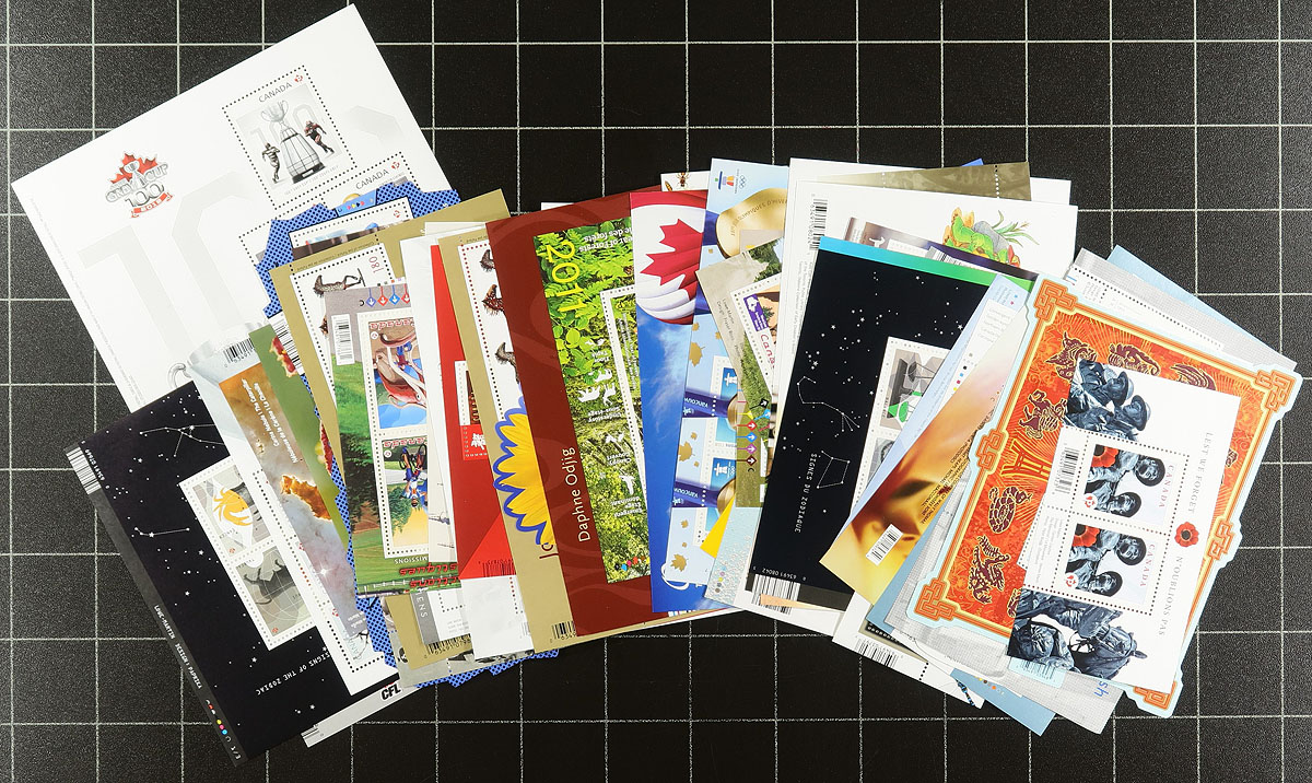 Modern Souvenir Sheets. An attractive holding of all-different modern souvenir sheets, including many "P" value stamps / mixed $1.00 PLUS values. A total of 72 sheets, including Superman, 2010 Olympics, Snow Mammals, Roadside Attractions, Joe Fafard, CFL, Remembrance Day, CAPEX, Lunar New Year, Maud Lewis, Gingerbread Houses etc. Conservatively valued for the total face value / usable postage. Face value =