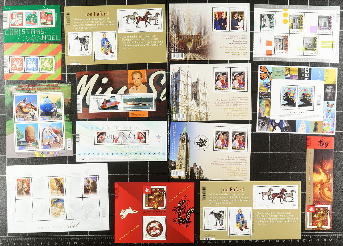 Modern Souvenir Sheets. An attractive holding of all-different modern souvenir sheets, including many "P" value stamps / mixed $1.00 PLUS values. A total of 72 sheets, including Superman, 2010 Olympics, Snow Mammals, Roadside Attractions, Joe Fafard, CFL, Remembrance Day, CAPEX, Lunar New Year, Maud Lewis, Gingerbread Houses etc. Conservatively valued for the total face value / usable postage. Face value =