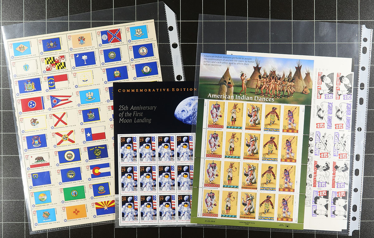 Mostly Modern Mint Sheet Holding. A small stack of mostly modern US sheets, including Celebrate the Century, Comic Strip Classics, Classic American Aircraft etc, plus a smattering of older issues, including everything from Moon Landing to Elvis. Conservativly valued for the postage value alone. Total face value US$294.44 in Canadian Dollars =