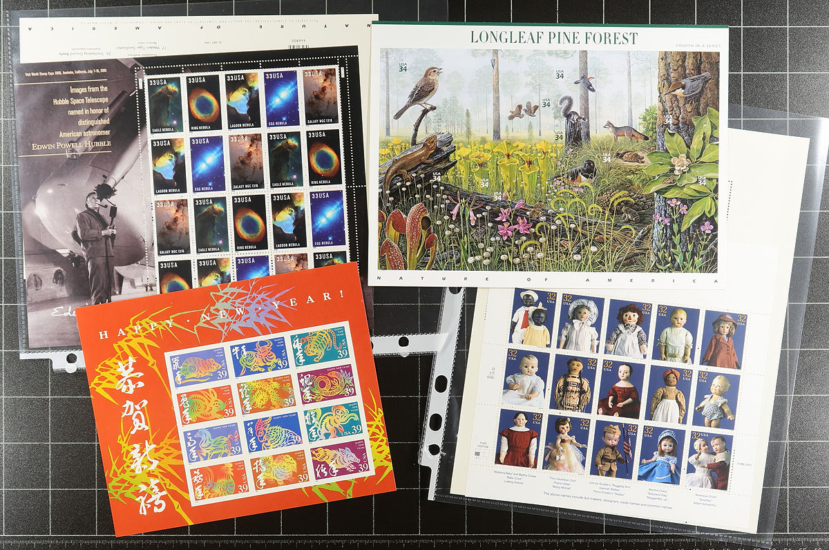 Mostly Modern Mint Sheet Holding. A small stack of mostly modern US sheets, including Celebrate the Century, Comic Strip Classics, Classic American Aircraft etc, plus a smattering of older issues, including everything from Moon Landing to Elvis. Conservativly valued for the postage value alone. Total face value US$294.44 in Canadian Dollars =