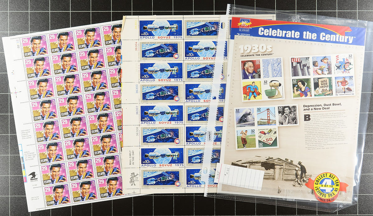 Mostly Modern Mint Sheet Holding. A small stack of mostly modern US sheets, including Celebrate the Century, Comic Strip Classics, Classic American Aircraft etc, plus a smattering of older issues, including everything from Moon Landing to Elvis. Conservativly valued for the postage value alone. Total face value US$294.44 in Canadian Dollars =