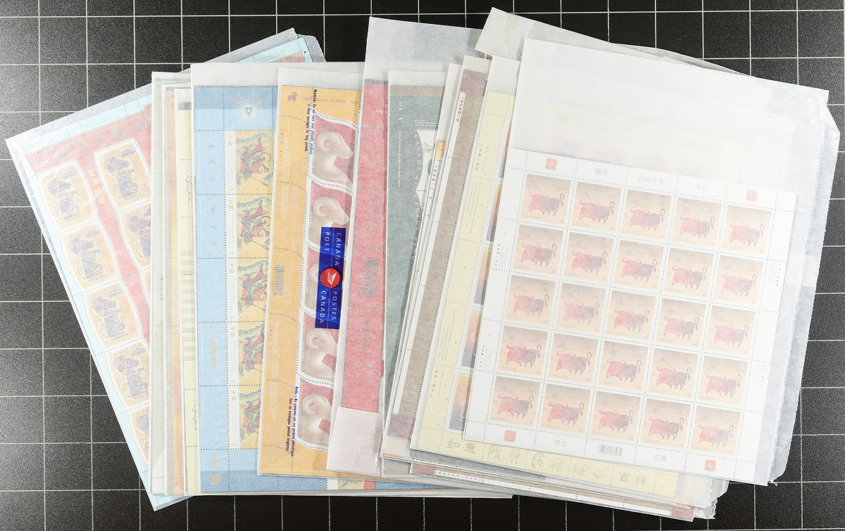 Modern Lunar New Years Complete Mint Never Hinged Sheets. A "lucky" selection of 13 different complete sheets of the Lunar New Years issues, from 1997-2009. This covers the complete "first set" of 12 issues, plus the first issue of the "second series". One of the most popular stamp issue themes, so popular that once the full rotation of 12 years was completed, Canada Post decided to do it all over again. Valued for the face value only, but getting a complete run of these full sheets is a tough thing to assemble. Still in Post Office glassines. Total face value =