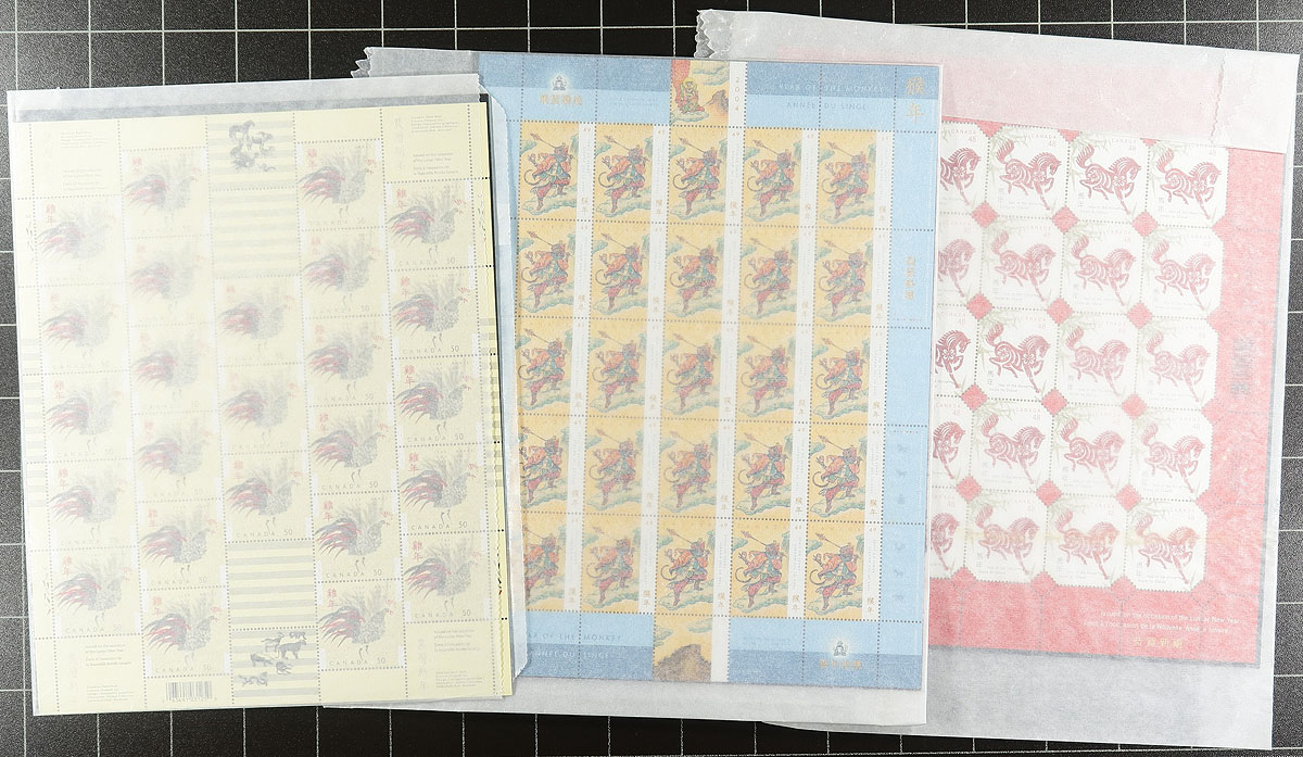 Modern Lunar New Years Complete Mint Never Hinged Sheets. A "lucky" selection of 13 different complete sheets of the Lunar New Years issues, from 1997-2009. This covers the complete "first set" of 12 issues, plus the first issue of the "second series". One of the most popular stamp issue themes, so popular that once the full rotation of 12 years was completed, Canada Post decided to do it all over again. Valued for the face value only, but getting a complete run of these full sheets is a tough thing to assemble. Still in Post Office glassines. Total face value =