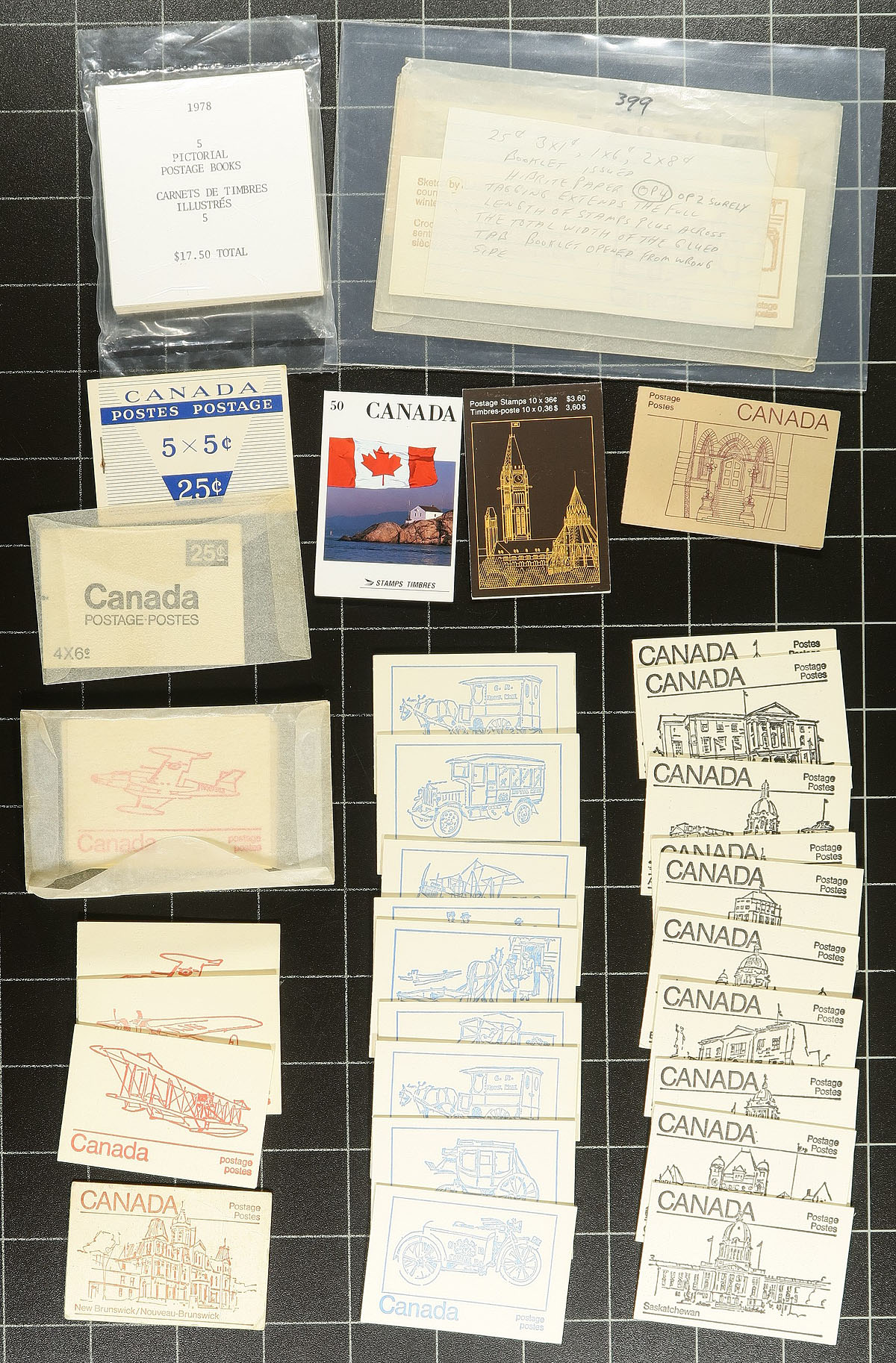 Booklet Bonanza. A small box, filled with an array of complete mint QEII era booklets from the 1967 Centennial's to modern "P", but most landing somewhere in the middle. Conservatively valued for the total usable postage only. Total face value =