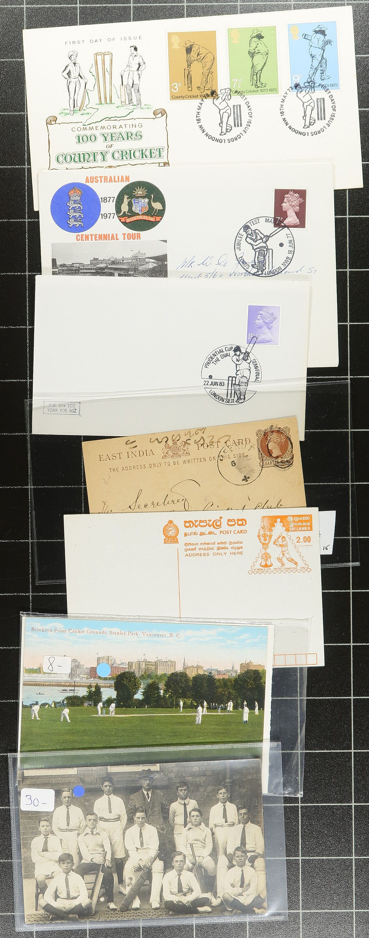 Cricket Topical Selection. An interesting and not often seen collection of Cricket Topicals (the sport, not the insect). Includes a 32-page Unisafe brand stockbook with over 200 mint Never Hinged stamps (mostly from West Indies, with some duplication), plus 23 special event covers or First Day Covers and lastly 19 postcards. The gems in the group are the postcards, which are mostly picture postcards including early RPPC (real photo postcards), but also includes an 1890 India stationery postcard advertising cricket equipment. Assembled over years, acquired one at a time by the previous owner. Estimate =