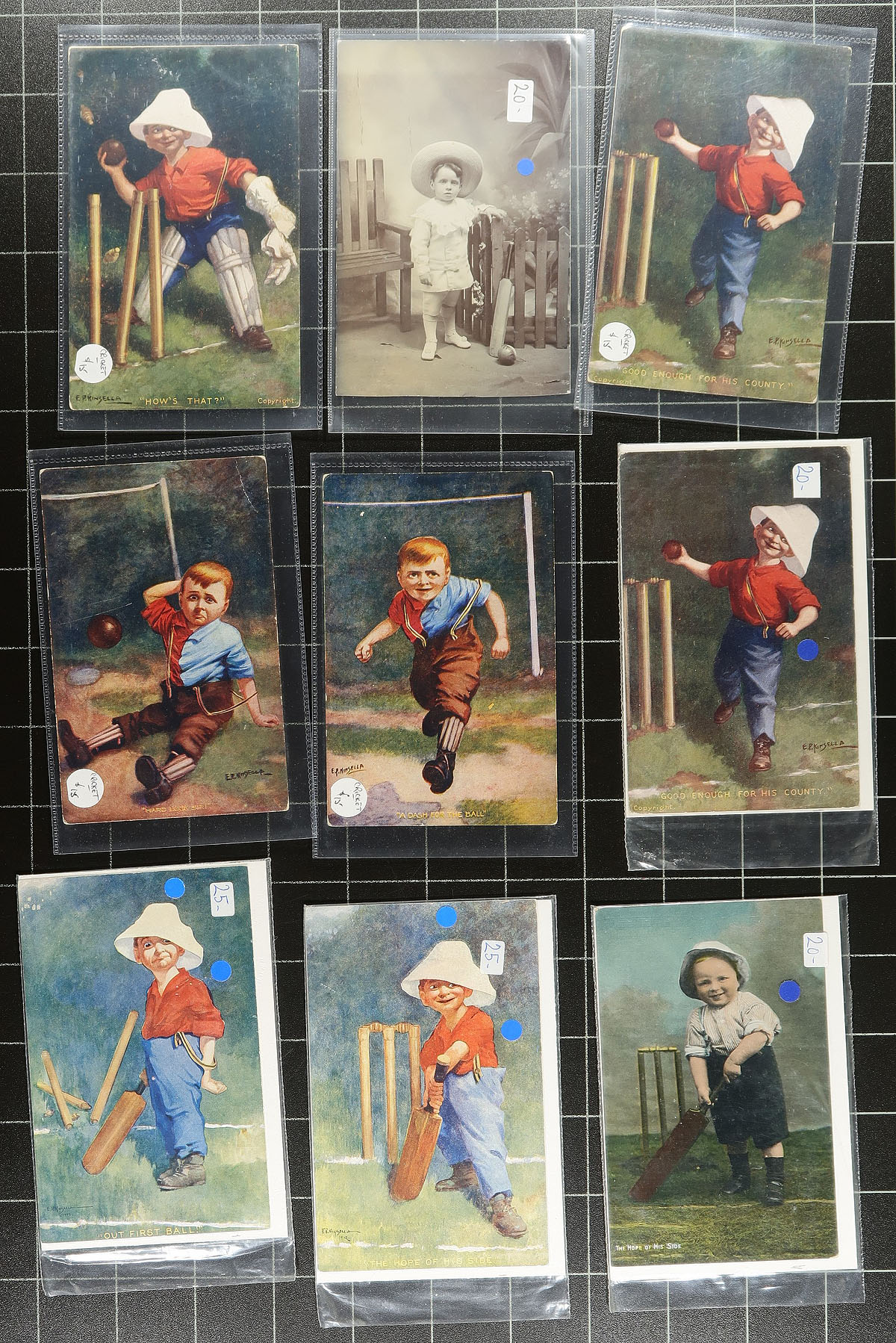 Cricket Topical Selection. An interesting and not often seen collection of Cricket Topicals (the sport, not the insect). Includes a 32-page Unisafe brand stockbook with over 200 mint Never Hinged stamps (mostly from West Indies, with some duplication), plus 23 special event covers or First Day Covers and lastly 19 postcards. The gems in the group are the postcards, which are mostly picture postcards including early RPPC (real photo postcards), but also includes an 1890 India stationery postcard advertising cricket equipment. Assembled over years, acquired one at a time by the previous owner. Estimate =