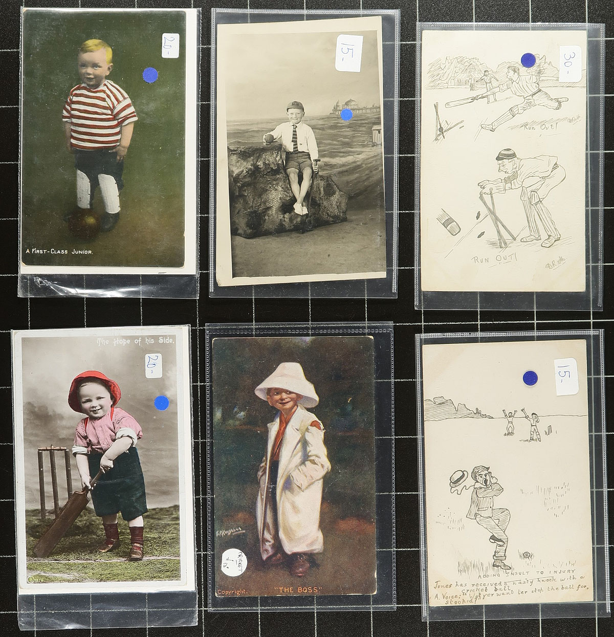 Cricket Topical Selection. An interesting and not often seen collection of Cricket Topicals (the sport, not the insect). Includes a 32-page Unisafe brand stockbook with over 200 mint Never Hinged stamps (mostly from West Indies, with some duplication), plus 23 special event covers or First Day Covers and lastly 19 postcards. The gems in the group are the postcards, which are mostly picture postcards including early RPPC (real photo postcards), but also includes an 1890 India stationery postcard advertising cricket equipment. Assembled over years, acquired one at a time by the previous owner. Estimate =
