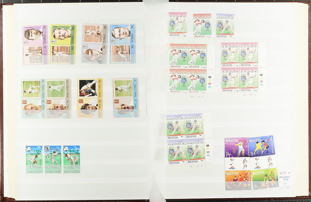Cricket Topical Selection. An interesting and not often seen collection of Cricket Topicals (the sport, not the insect). Includes a 32-page Unisafe brand stockbook with over 200 mint Never Hinged stamps (mostly from West Indies, with some duplication), plus 23 special event covers or First Day Covers and lastly 19 postcards. The gems in the group are the postcards, which are mostly picture postcards including early RPPC (real photo postcards), but also includes an 1890 India stationery postcard advertising cricket equipment. Assembled over years, acquired one at a time by the previous owner. Estimate =
