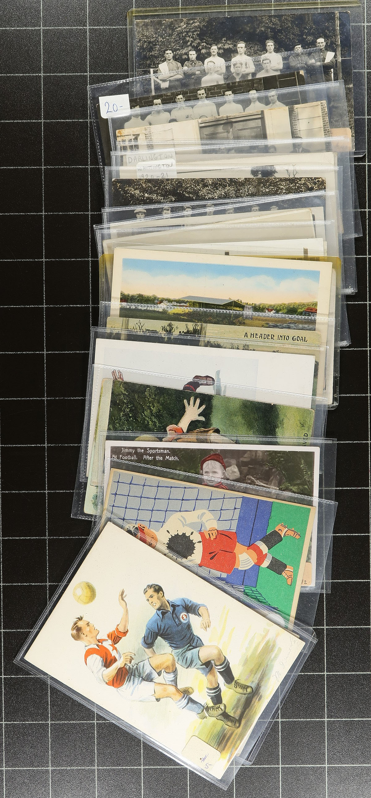 A compact but powerful selection of 18 postcards, all with a Soccer (Football) theme. Includes many early RPPC (real photo postcards) including "Team Photos", primarily British in origin. A popular collecting area. Each item is still in the original sleeve from when purchased. Total retail as marked adds up to $410.00. Estimate =