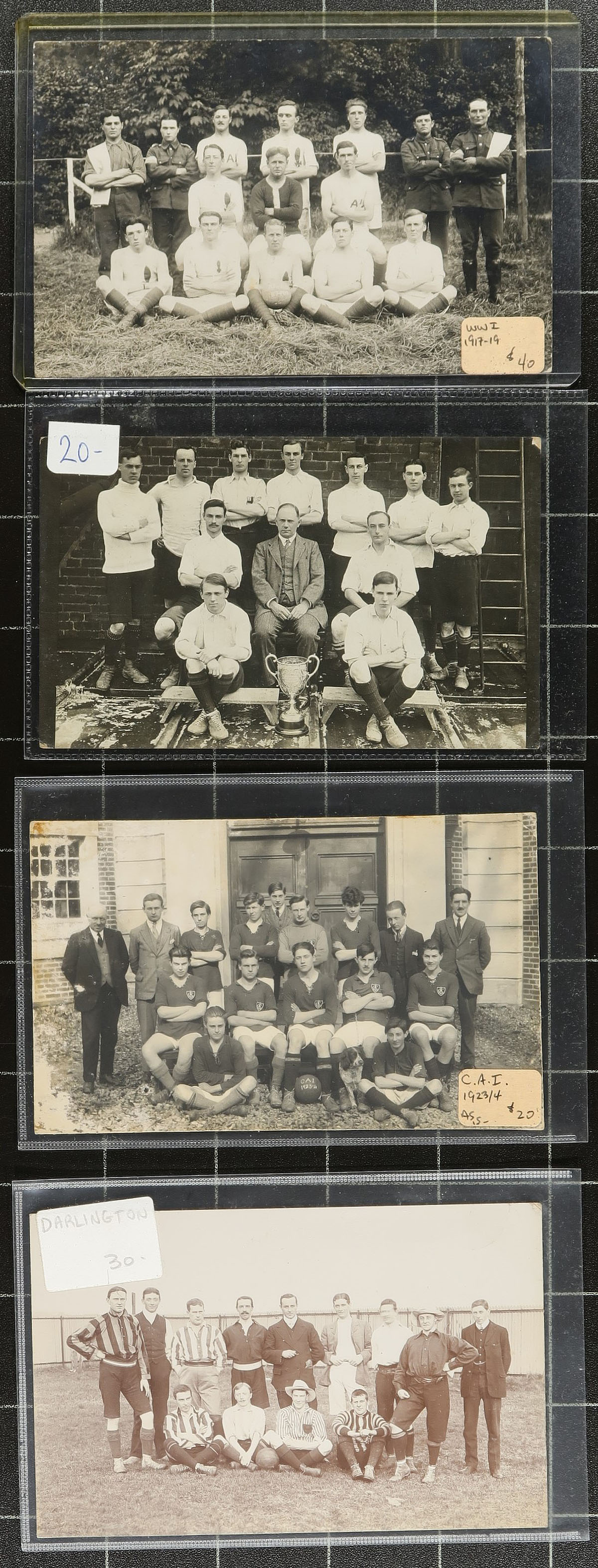 A compact but powerful selection of 18 postcards, all with a Soccer (Football) theme. Includes many early RPPC (real photo postcards) including "Team Photos", primarily British in origin. A popular collecting area. Each item is still in the original sleeve from when purchased. Total retail as marked adds up to $410.00. Estimate =