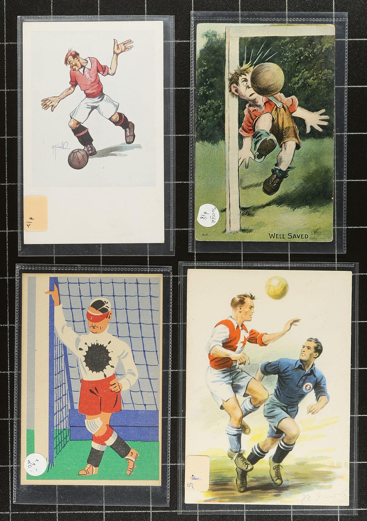 A compact but powerful selection of 18 postcards, all with a Soccer (Football) theme. Includes many early RPPC (real photo postcards) including "Team Photos", primarily British in origin. A popular collecting area. Each item is still in the original sleeve from when purchased. Total retail as marked adds up to $410.00. Estimate =