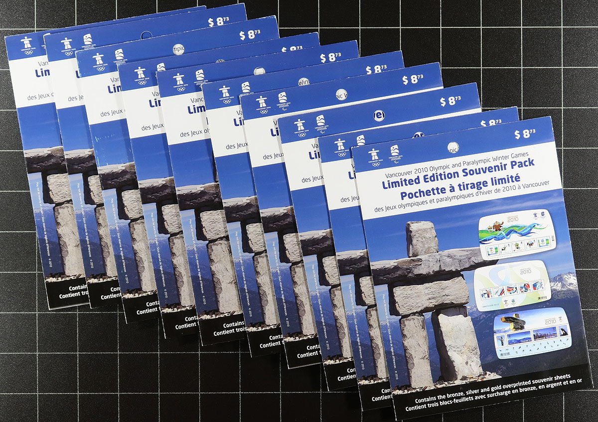 Exceptional investment opportunity consisting of ten complete VF MNH complete sets (all still sealed in the original souvenir packs) of the limited edition gold, silver and bronze "Vancouver 2010" overprints in the selvedge of three different Olympic souvenir sheets. A real sleeper set, probably the scarcest of all the Canada 2010 Olympic philatelic issues. Sure to increase in value due to the international appeal of Olympic topicals. 2024 Unitrade =