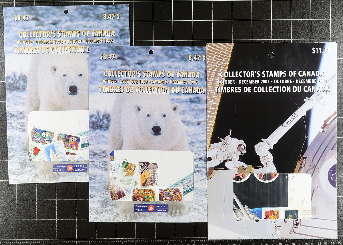 Quarterly Pack Potpourri. An "odds and ends" offering of 10 Post Office sealed Quarterly Packs. Includes 1997 (Q4 x2), 2005 (Q3), 2006 (Q3, Q4), 2010 (Q1, Q2, Q4), 2013 (Q2). Includes many sought-after die cut singles as well as blocks and souvenir sheets. These are now listed in Unitrade but not yet priced, conservatively grouped / counted by the original purchase price, which is lower than what is actually enclosed in the pack due to the increase in value of the Permanent stamps. Original Canada Post cost =
