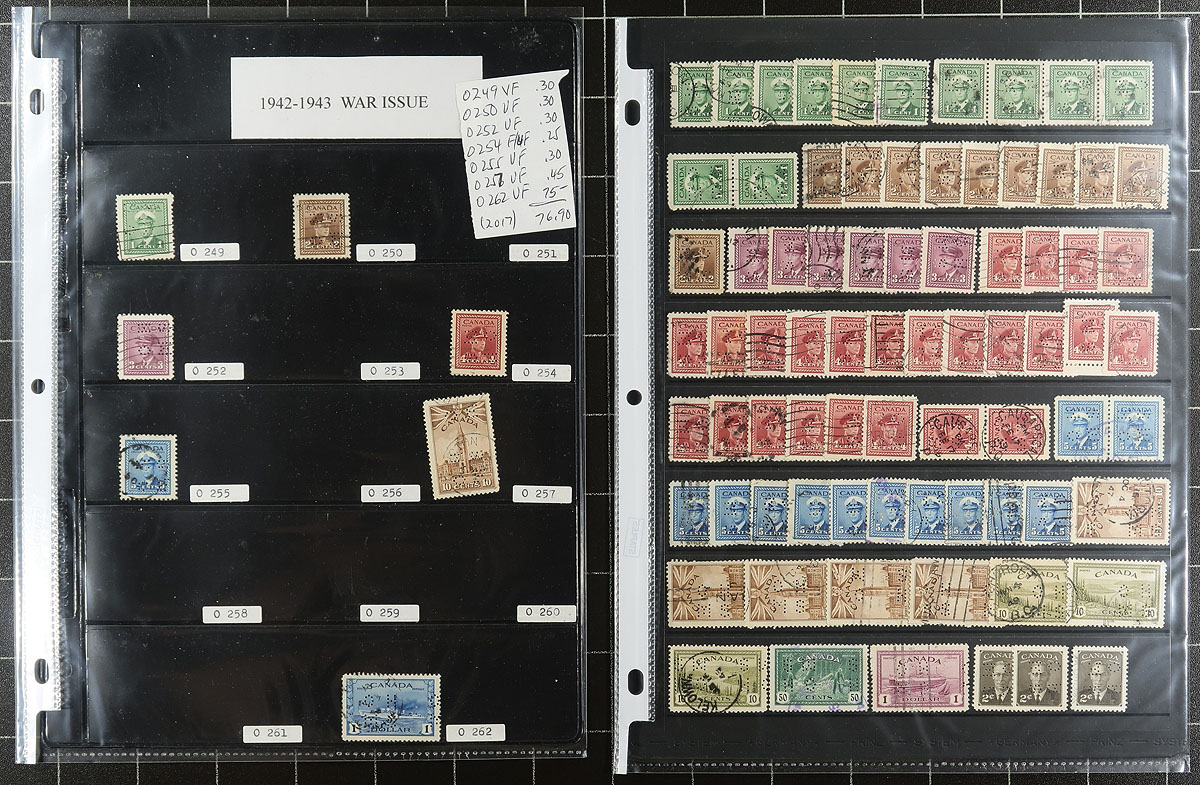 Mostly used selection/stock/accumulation of 4-hole (plus a few 5-hole) OHMS official perfins, all laid out on stockpages. Conservatively valued by an older Unitrade (so will need an update to the new numbers) with no premiums added for VF centering or NH. All are also unchecked for the different perfin positions. A great offering for the student of these increasingly popular officials. See the scan of the thumbnail inventory for the list of the better stamps in the mix. The owner's original 2017 Unitrade catalogue value was $951.36. Estimate =