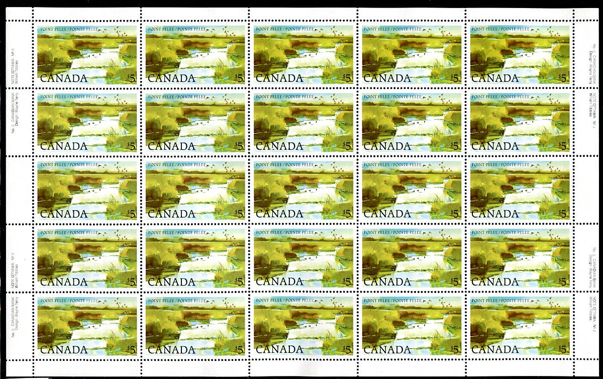 VF mint Never Hinged complete pane of 25 of the 1984 plate #2 printing on Clark paper of the $5.00 Point Pelee high value. Catalogued as matched set of plate blocks and 9 singles. Face value alone is $125.00! 2024 Unitrade =