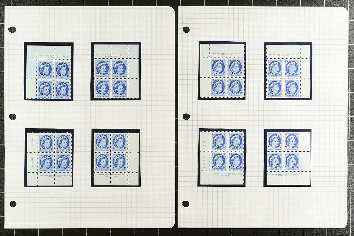Exceptionally high quality, almost all VF mint NH, complete run of all the matched sets of all the plate blocks of the "G" overprint official overprint on the QEII Wilding issues. These blocks have all been carefully stored for over 58 years and are all as fresh as the day they were printed. The only blocks that are not VFNH are #O41 plate 1 UL (FNH), #O44 plate 5 UR (VFH) and #O44 plate 7 LR (FNH). 68 different blocks in total. See the scan of the owner's accurate inventory for the full listing. 2024 Unitrade =