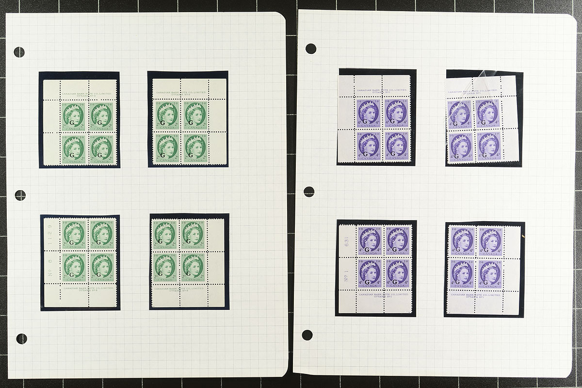 Exceptionally high quality, almost all VF mint NH, complete run of all the matched sets of all the plate blocks of the "G" overprint official overprint on the QEII Wilding issues. These blocks have all been carefully stored for over 58 years and are all as fresh as the day they were printed. The only blocks that are not VFNH are #O41 plate 1 UL (FNH), #O44 plate 5 UR (VFH) and #O44 plate 7 LR (FNH). 68 different blocks in total. See the scan of the owner's accurate inventory for the full listing. 2024 Unitrade =