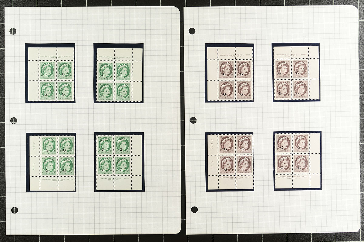 Exceptionally high quality, almost all VF mint NH, complete run of all the matched sets of all the plate blocks of the "G" overprint official overprint on the QEII Wilding issues. These blocks have all been carefully stored for over 58 years and are all as fresh as the day they were printed. The only blocks that are not VFNH are #O41 plate 1 UL (FNH), #O44 plate 5 UR (VFH) and #O44 plate 7 LR (FNH). 68 different blocks in total. See the scan of the owner's accurate inventory for the full listing. 2024 Unitrade =