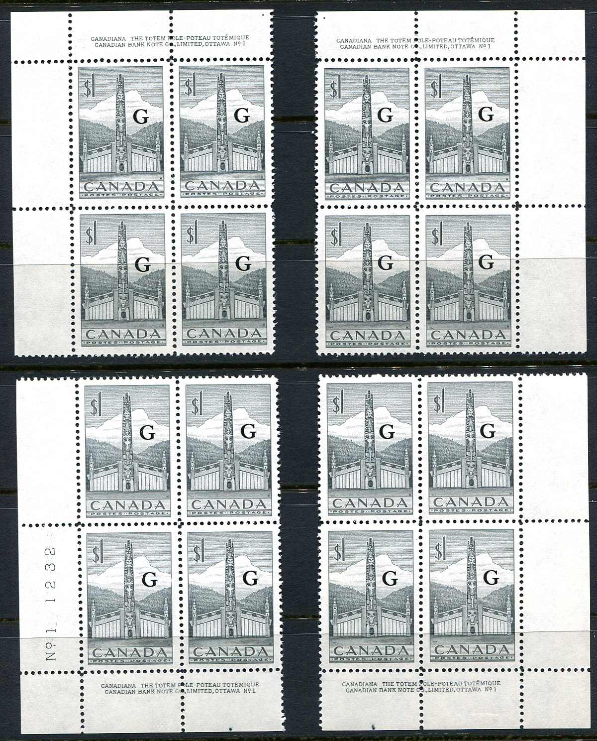 VF mint Never Hinged matched set of plate #1 plate blocks of the "G" official overprinted $1.00 Totem. 2024 Unitrade =