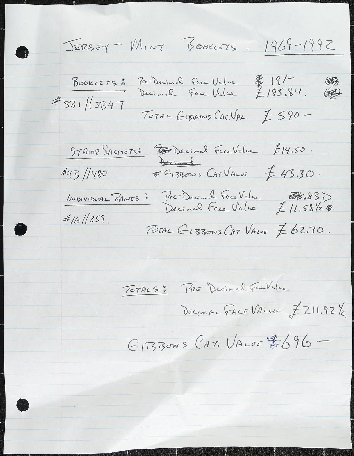 Booklets, Sachets and Panes. VF mint NH selection of 1969-1992 period issues, all identified and neatly sorted into manila envelopes by type (complete booklet, sachet or pane). Moderate and useful duplication of this clean material. The total face value of useable decimal issues is £211.92 = $340.00. Older pre-decimal issues were not counted in the face total. SG Collect Channel Islands catalogue £696.00 in Canadian Dollars =