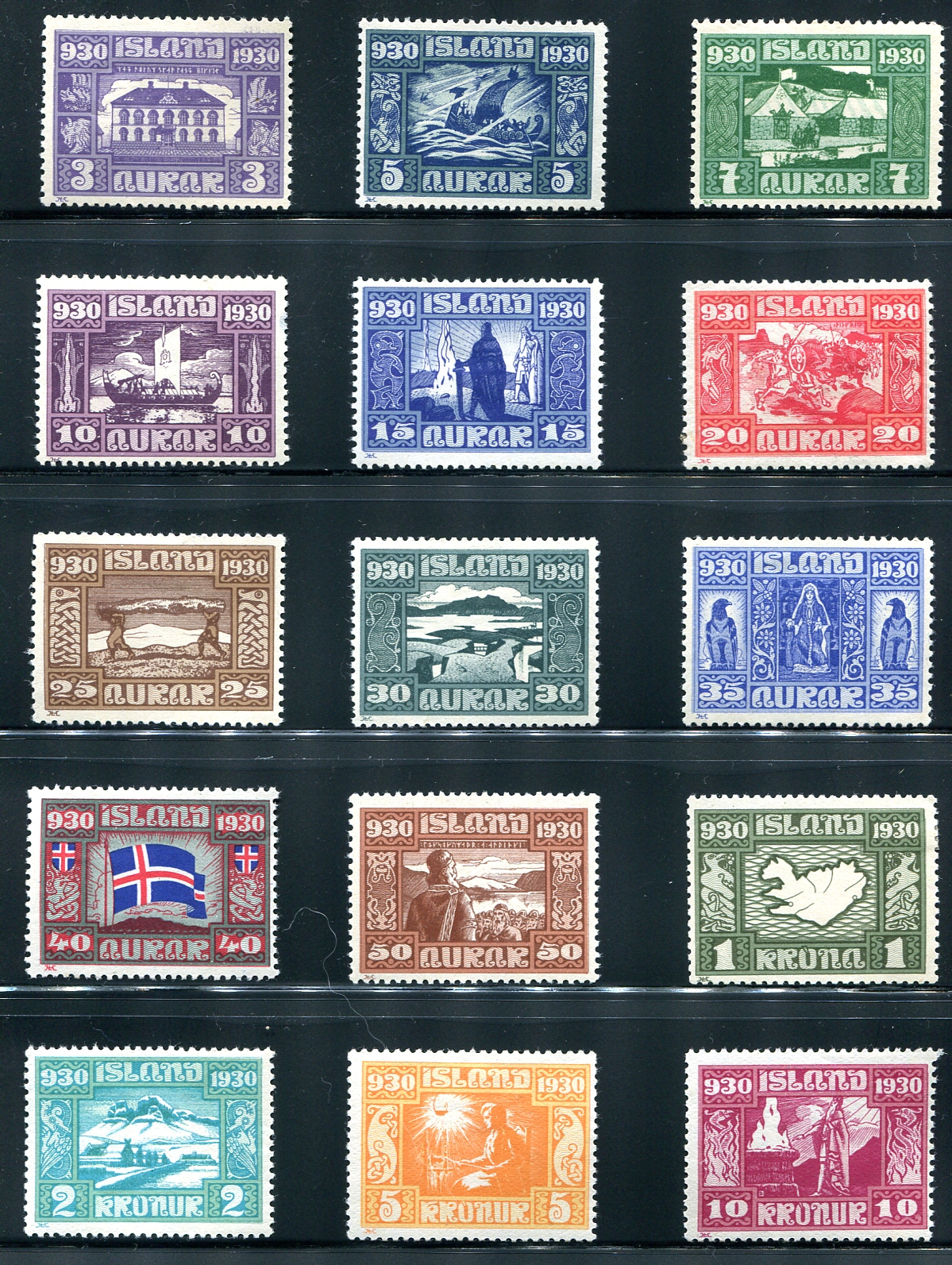 Complete mint Hinged / Hinge Remnant "Millenary of Parliament" set of 15 issued on New Years Day, 1930. Only 21,000 sets were ever possible. One of the most iconic sets of stamps produced by the Iceland Post Office. 2024 Scott US$347.25 =