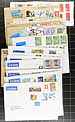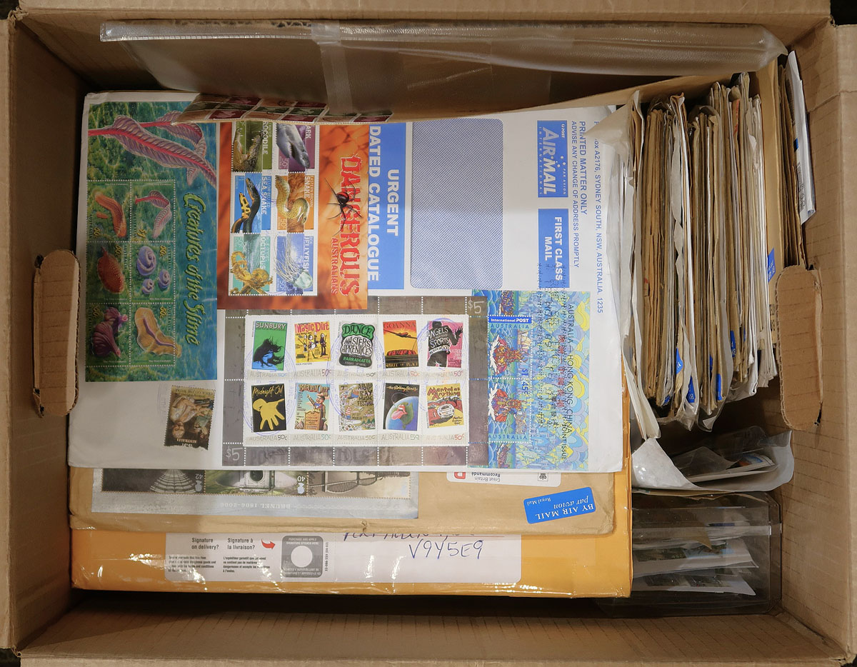 A colourful lot containing several hundred modern covers from philatelic purchases. A quick spot check indicated a mix of small to large sized envelopes, with a wide variety of frankings, including blocks, souvenir sheets, modern commemoratives, and high denominations, with the majority of mail from Australia, Great Britain, and Channel Islands, with a bit of Canada spotted, generally in the the post-2000 year range. Some material is on piece, with some uncancelled stamps on cover as well. A nice lot for the worldwide stamp collector looking to do a bit of soaking! Estimate =