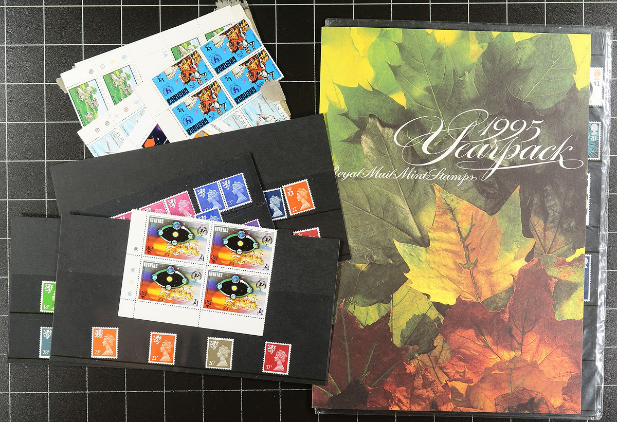 A "catch all" of mint material in a bankers box, with over 1,000 stamps in a variety of formats, including thematic packs, stockbooks, annual collections, glassines, blocks, sheets, and more. We note better representation from Austria, Great Britain, and Commonwealth countries, and more, generally ranging from the 1970's to the 1990's. A nice lot for the worldwide collector. Estimate =