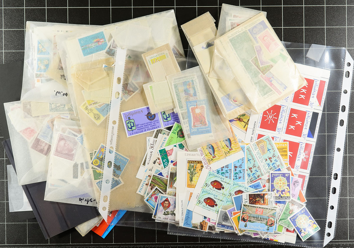 A "catch all" of mint material in a bankers box, with over 1,000 stamps in a variety of formats, including thematic packs, stockbooks, annual collections, glassines, blocks, sheets, and more. We note better representation from Austria, Great Britain, and Commonwealth countries, and more, generally ranging from the 1970's to the 1990's. A nice lot for the worldwide collector. Estimate =