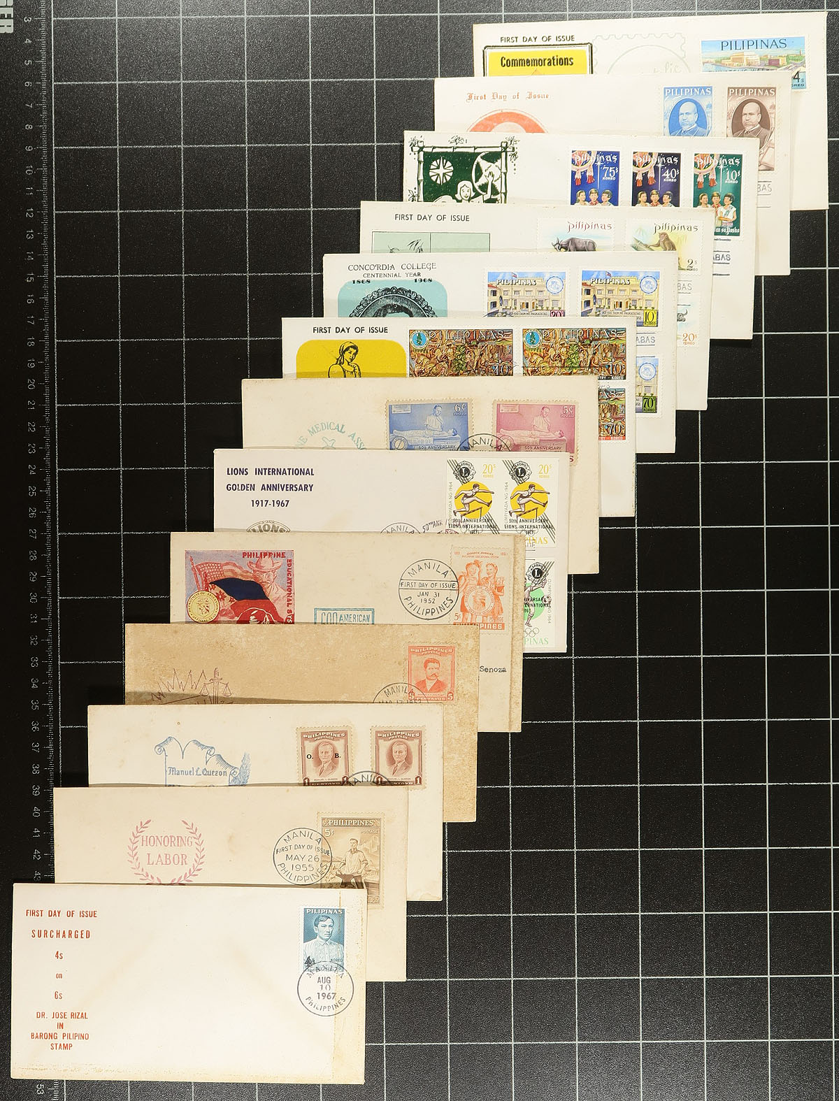 Group of 155 Philippines first day covers, ranging from the 1950's to the early 1970's, with singles, pairs, blocks, and sets frankings, including some very colorful cachets and a few interesting postmarks. Some toning on a few of the early covers, otherwise a very fine group. Estimate =