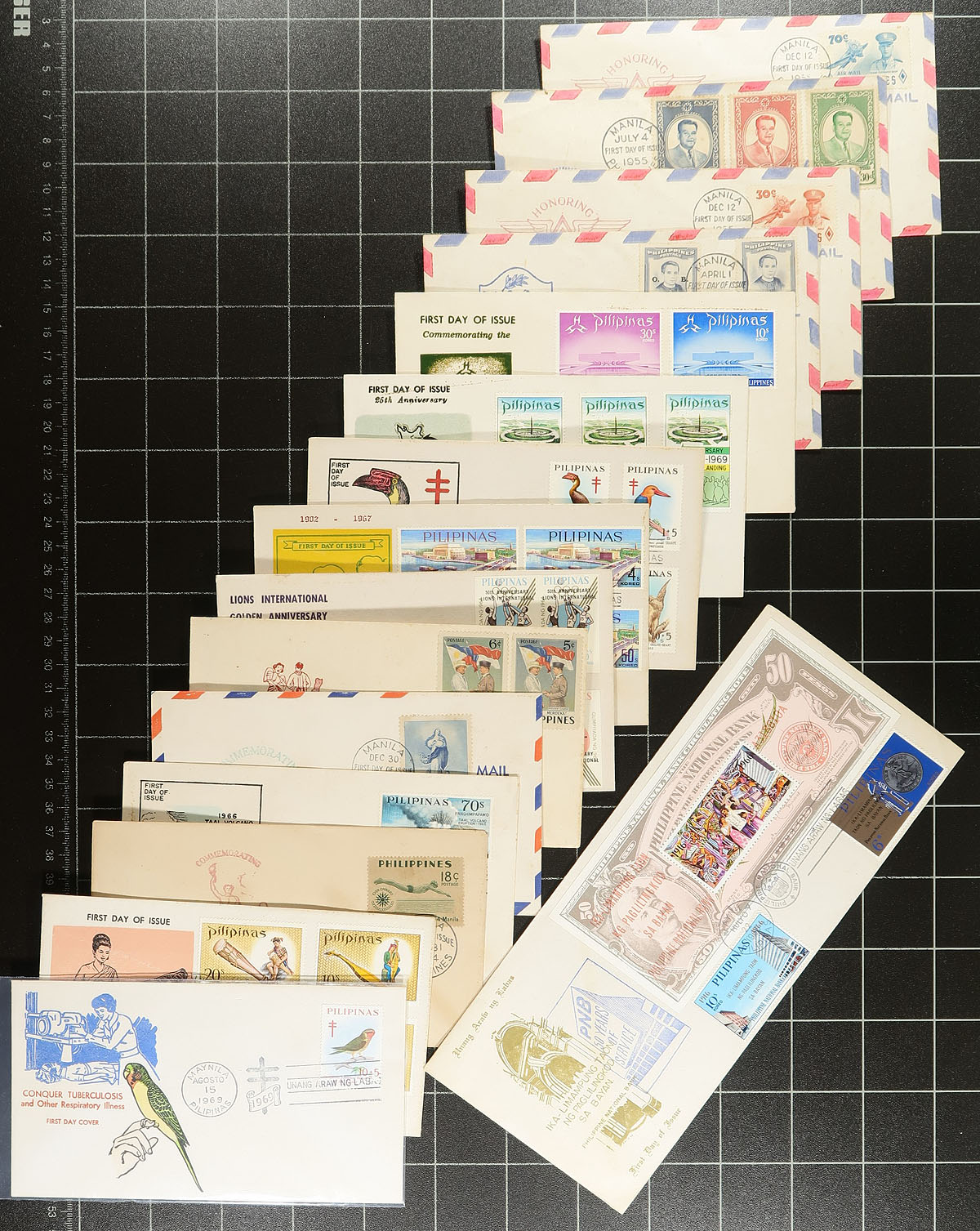 Group of 155 Philippines first day covers, ranging from the 1950's to the early 1970's, with singles, pairs, blocks, and sets frankings, including some very colorful cachets and a few interesting postmarks. Some toning on a few of the early covers, otherwise a very fine group. Estimate =