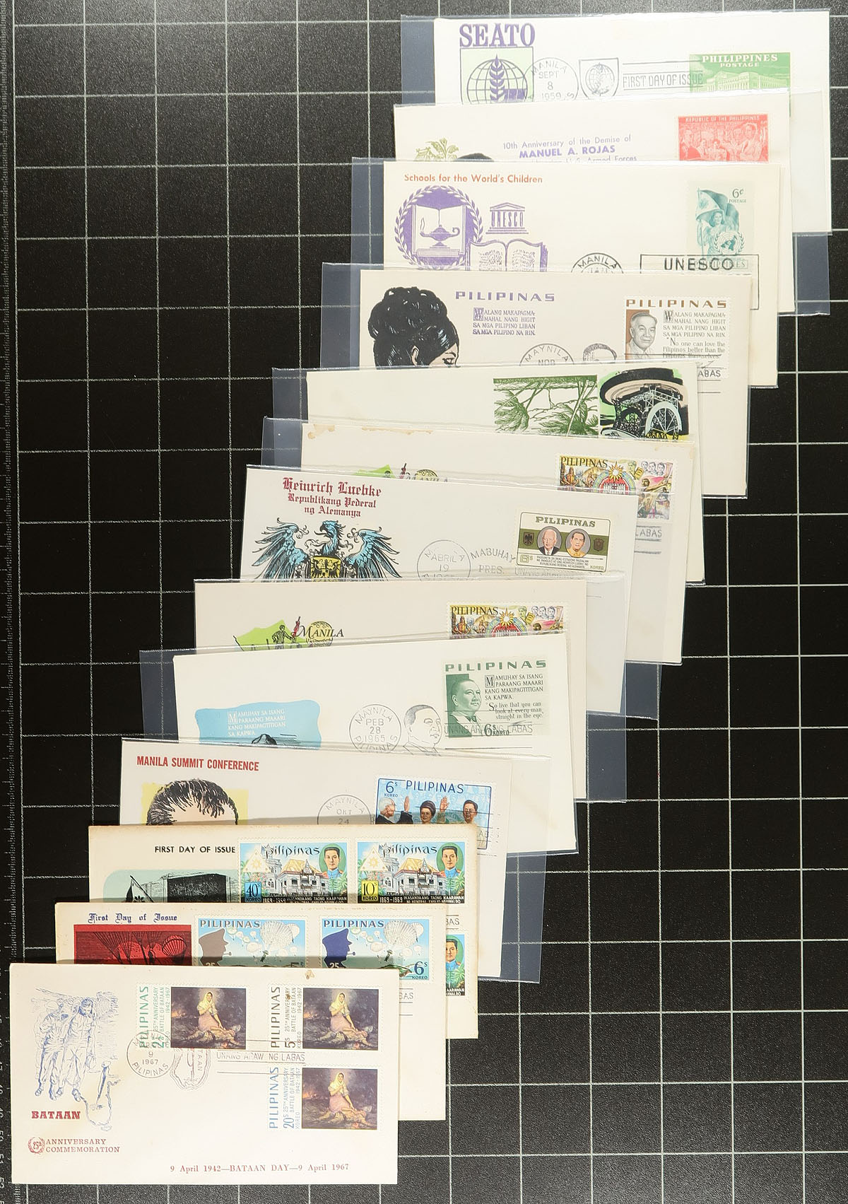 Group of 155 Philippines first day covers, ranging from the 1950's to the early 1970's, with singles, pairs, blocks, and sets frankings, including some very colorful cachets and a few interesting postmarks. Some toning on a few of the early covers, otherwise a very fine group. Estimate =