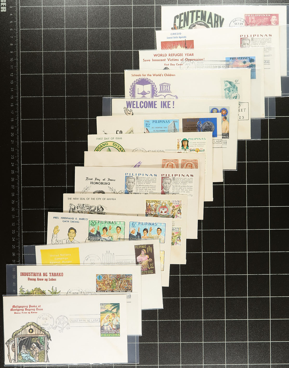 Group of 155 Philippines first day covers, ranging from the 1950's to the early 1970's, with singles, pairs, blocks, and sets frankings, including some very colorful cachets and a few interesting postmarks. Some toning on a few of the early covers, otherwise a very fine group. Estimate =