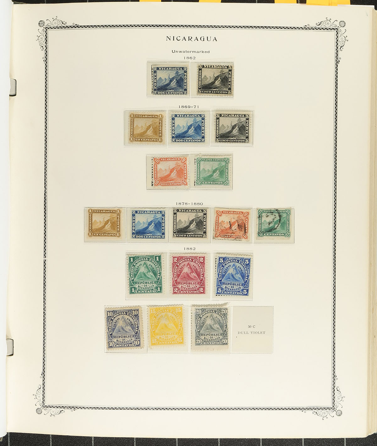 Clean collection of primarily mint Nicaragua, 1862-1976, containing roughly 875 stamps, well organized in a Scott Specialty Album (mostly in hingeless mounts). The collection generally ranges from Scott #3/1037, and also includes selections of airmails, postage dues, and other back of the book material, and modern material on additional pages. A spot check indicated a few stamps and partial sets cataloguing in the $5 to $20 and up range. Owner's older Scott catalogue value for the collection totals US$2,616.00 ($3531.00 CDN). A nice collection that should be expanded, overall fine to very fine. Estimate =