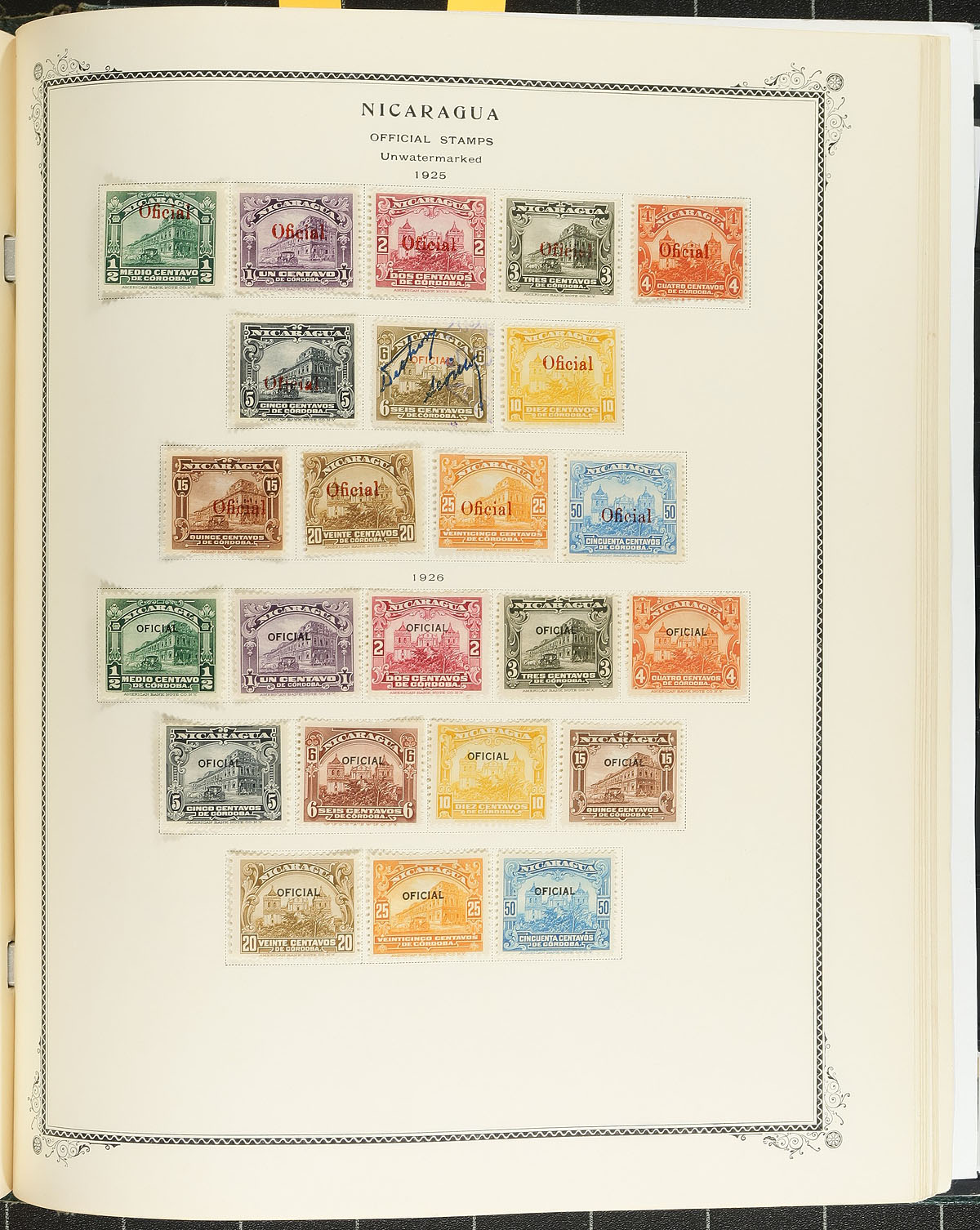 Clean collection of primarily mint Nicaragua, 1862-1976, containing roughly 875 stamps, well organized in a Scott Specialty Album (mostly in hingeless mounts). The collection generally ranges from Scott #3/1037, and also includes selections of airmails, postage dues, and other back of the book material, and modern material on additional pages. A spot check indicated a few stamps and partial sets cataloguing in the $5 to $20 and up range. Owner's older Scott catalogue value for the collection totals US$2,616.00 ($3531.00 CDN). A nice collection that should be expanded, overall fine to very fine. Estimate =