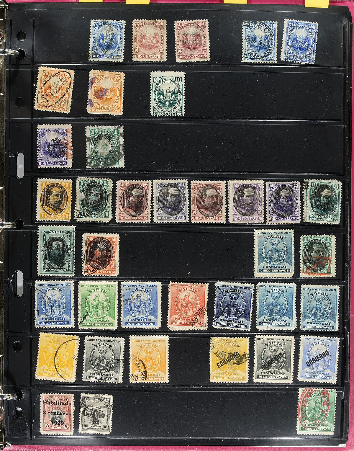 Collection / Accumulation of primarily used Peru, 1857-1975, containing roughly 750 in 15 double sided Vario stockpages. A nice starter group from this underappreciated collecting area, which includes a selection of "back of the book" issues. Owner's older Scott catalogue value for the lot totals US$960.00 ($1296.00 CDN). A few small faults noted with a few stamps, and a bit of duplication with a few issues. Estimate =