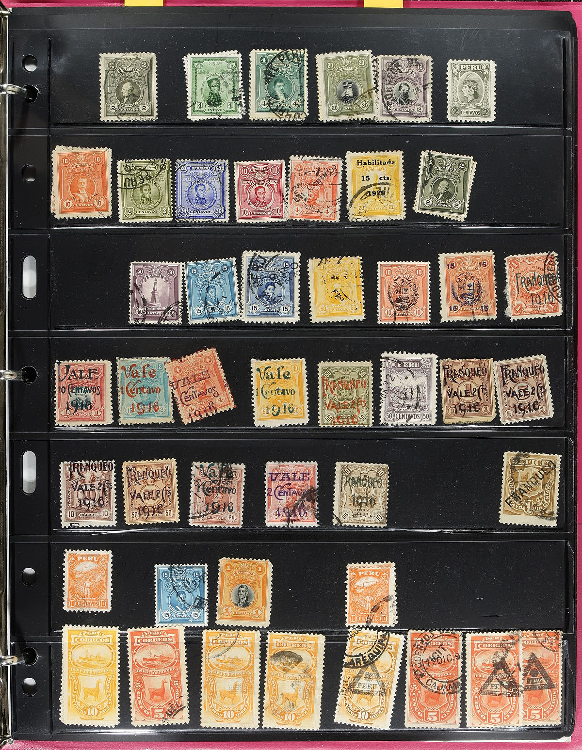 Collection / Accumulation of primarily used Peru, 1857-1975, containing roughly 750 in 15 double sided Vario stockpages. A nice starter group from this underappreciated collecting area, which includes a selection of "back of the book" issues. Owner's older Scott catalogue value for the lot totals US$960.00 ($1296.00 CDN). A few small faults noted with a few stamps, and a bit of duplication with a few issues. Estimate =