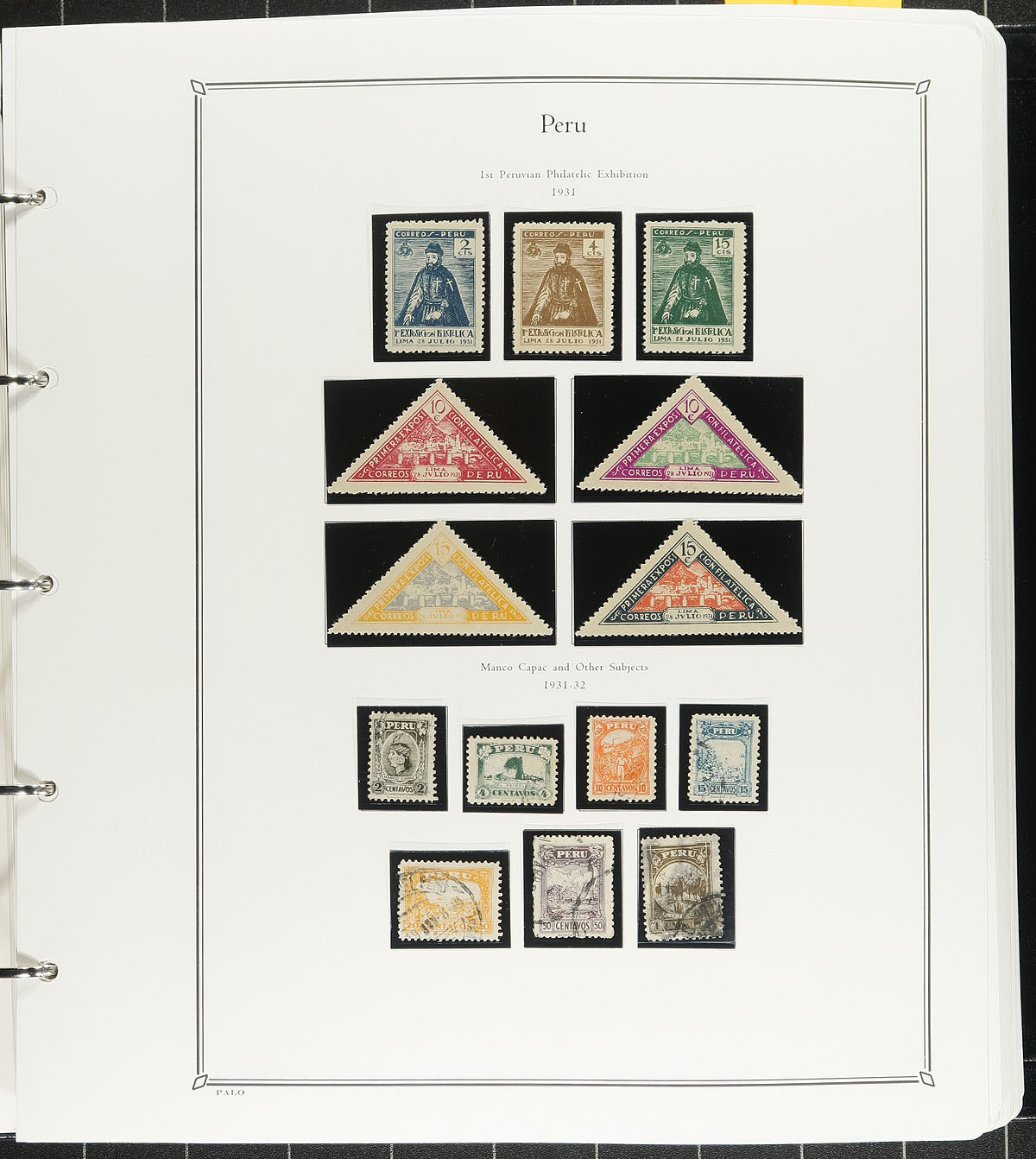 Lovely collection of primarily mint Peru, 1857-1978, containing just over 1,000 stamps, well organized on PALO album pages (in hingeless mounts), in a PALO binder. The collection generally ranges from Scott #3/673, along with a good run of airmail issues, along with postage dues, occupations, provisionals, and other "back of the book" issues. A spot check indicated singles, sets, and partial sets cataloguing $10 to $30 and up, including Scott #s 32-37 (used, $141 total), 234-241 (mh, $59), C81 souvenir sheet (lh, $55), just to name a few. Owner's older Scott catalogue value for the collection totals US$3,096.00 ($4179.60 CDN). A collection that begs to be continued. Estimate =