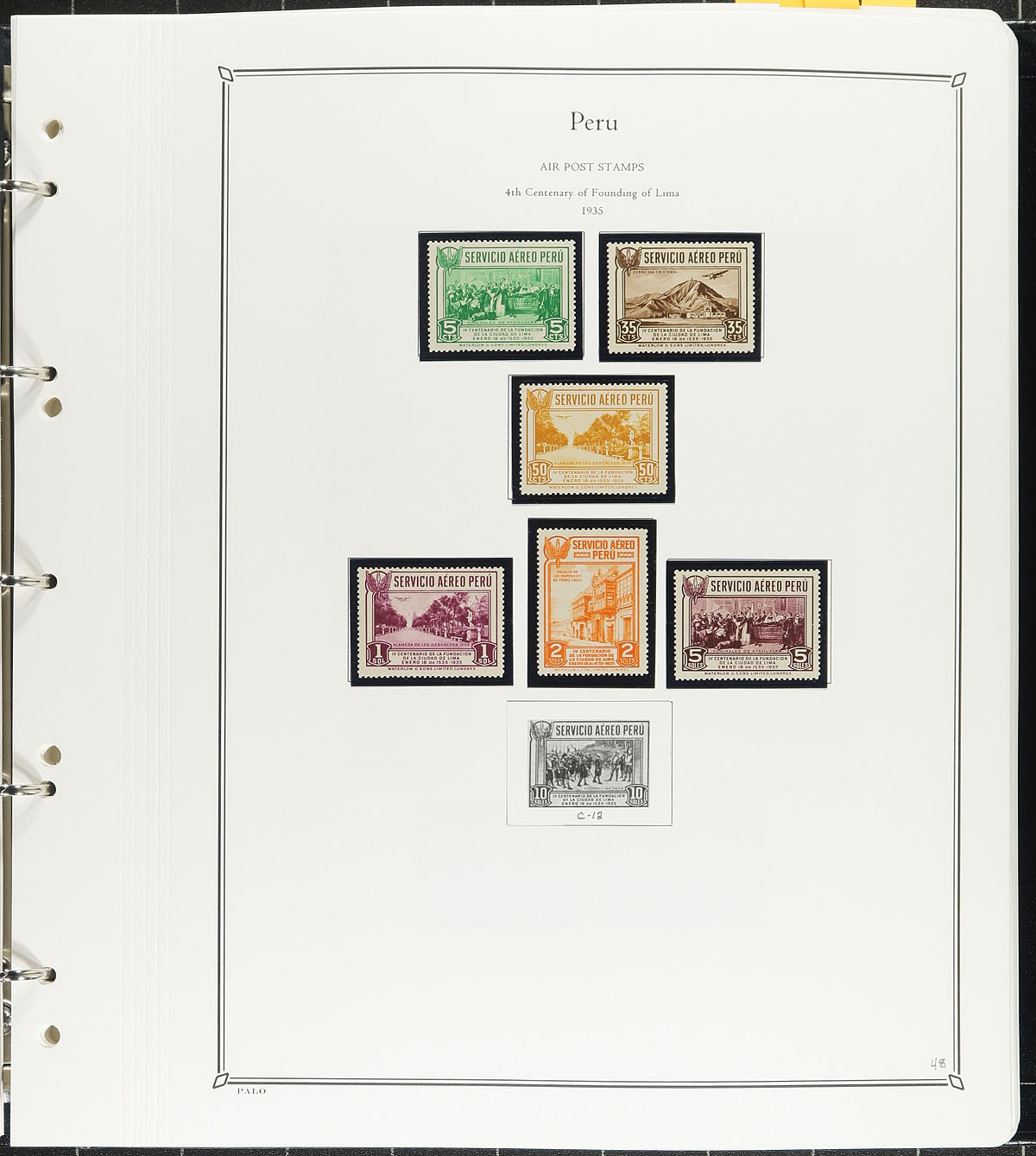 Lovely collection of primarily mint Peru, 1857-1978, containing just over 1,000 stamps, well organized on PALO album pages (in hingeless mounts), in a PALO binder. The collection generally ranges from Scott #3/673, along with a good run of airmail issues, along with postage dues, occupations, provisionals, and other "back of the book" issues. A spot check indicated singles, sets, and partial sets cataloguing $10 to $30 and up, including Scott #s 32-37 (used, $141 total), 234-241 (mh, $59), C81 souvenir sheet (lh, $55), just to name a few. Owner's older Scott catalogue value for the collection totals US$3,096.00 ($4179.60 CDN). A collection that begs to be continued. Estimate =