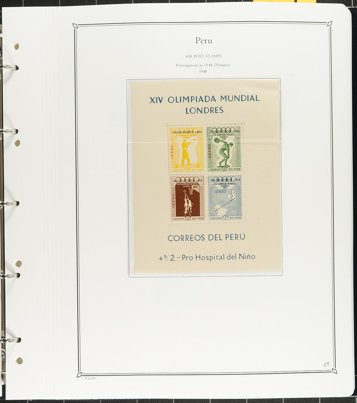 Lovely collection of primarily mint Peru, 1857-1978, containing just over 1,000 stamps, well organized on PALO album pages (in hingeless mounts), in a PALO binder. The collection generally ranges from Scott #3/673, along with a good run of airmail issues, along with postage dues, occupations, provisionals, and other "back of the book" issues. A spot check indicated singles, sets, and partial sets cataloguing $10 to $30 and up, including Scott #s 32-37 (used, $141 total), 234-241 (mh, $59), C81 souvenir sheet (lh, $55), just to name a few. Owner's older Scott catalogue value for the collection totals US$3,096.00 ($4179.60 CDN). A collection that begs to be continued. Estimate =