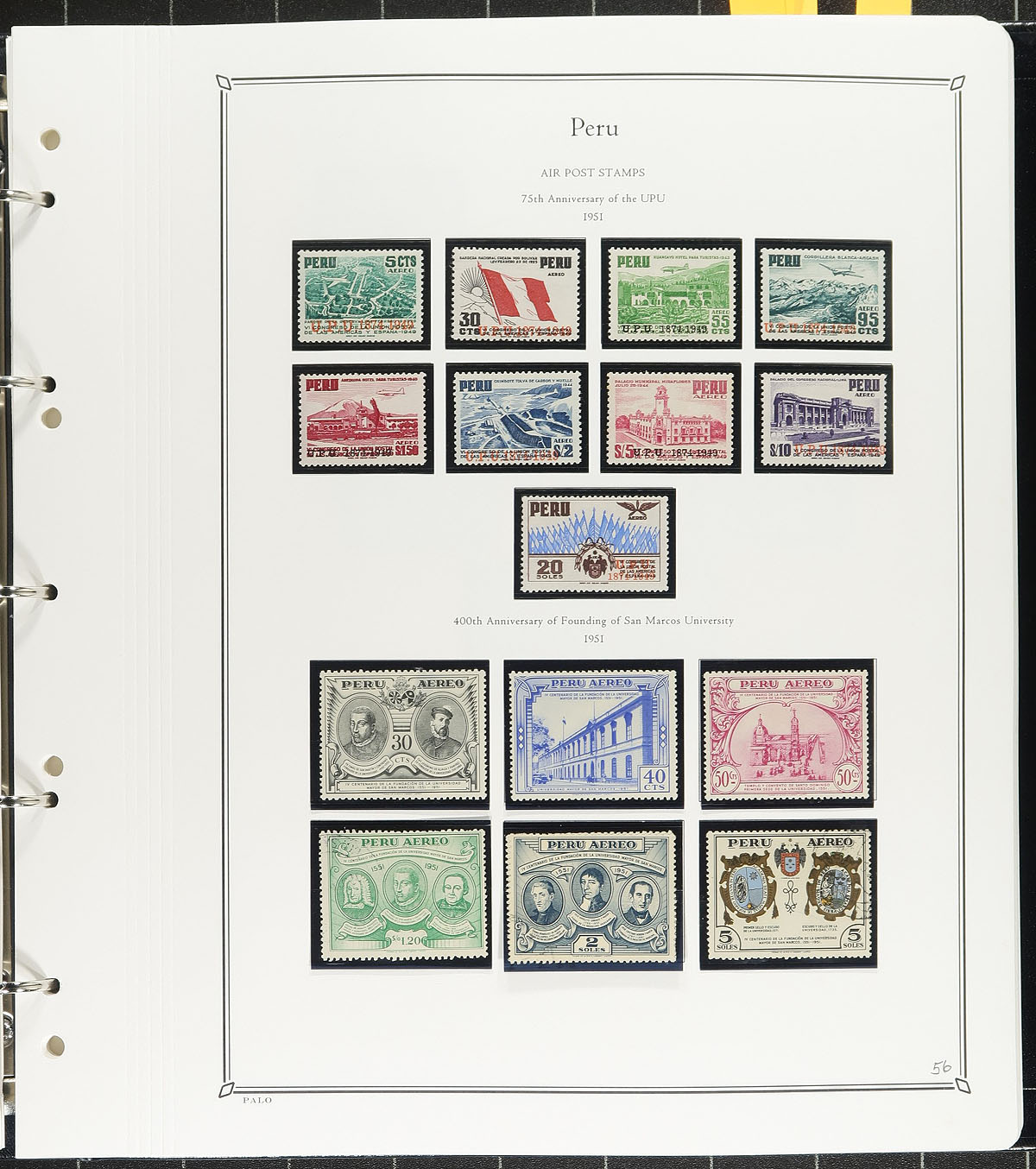 Lovely collection of primarily mint Peru, 1857-1978, containing just over 1,000 stamps, well organized on PALO album pages (in hingeless mounts), in a PALO binder. The collection generally ranges from Scott #3/673, along with a good run of airmail issues, along with postage dues, occupations, provisionals, and other "back of the book" issues. A spot check indicated singles, sets, and partial sets cataloguing $10 to $30 and up, including Scott #s 32-37 (used, $141 total), 234-241 (mh, $59), C81 souvenir sheet (lh, $55), just to name a few. Owner's older Scott catalogue value for the collection totals US$3,096.00 ($4179.60 CDN). A collection that begs to be continued. Estimate =