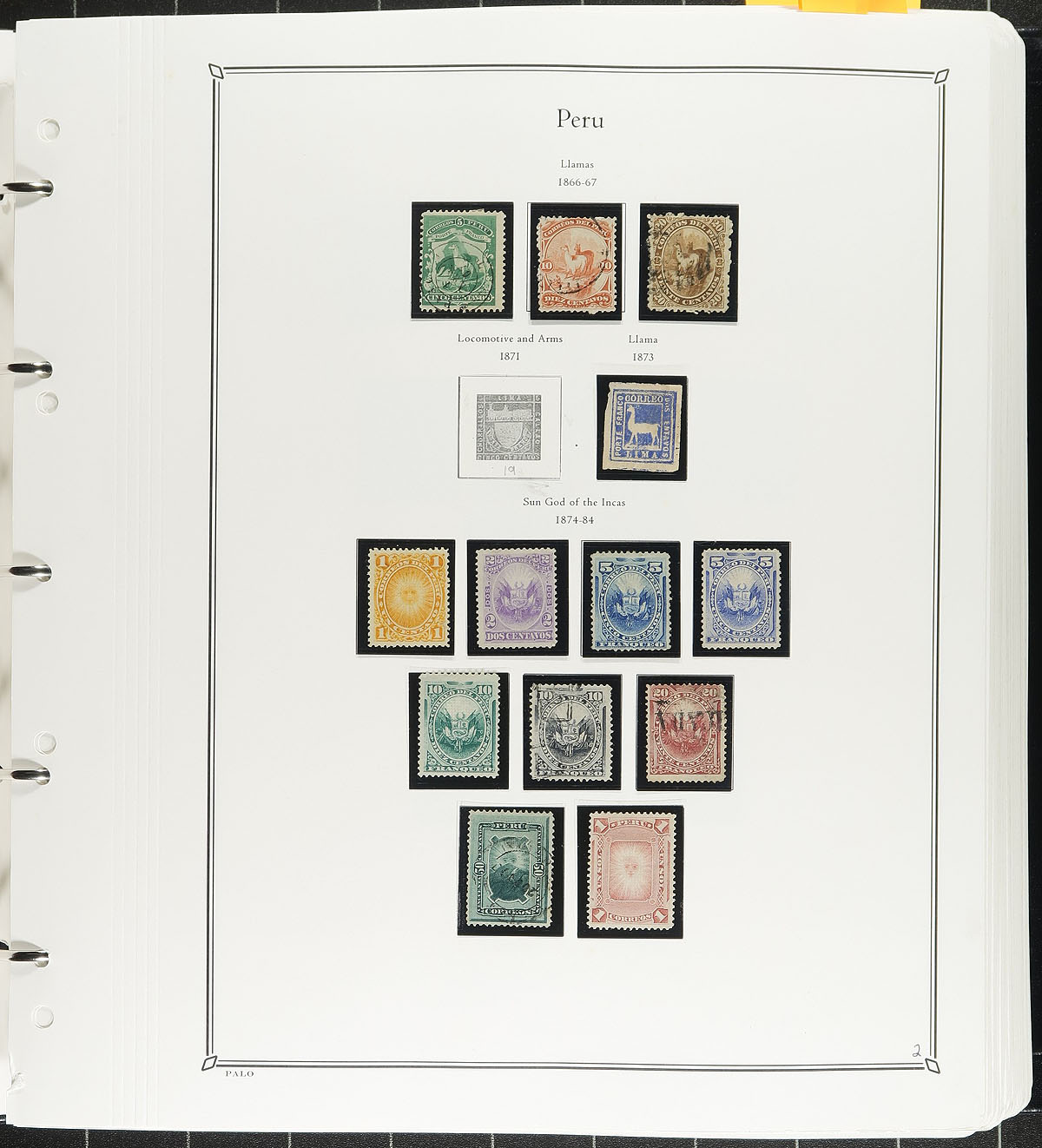 Lovely collection of primarily mint Peru, 1857-1978, containing just over 1,000 stamps, well organized on PALO album pages (in hingeless mounts), in a PALO binder. The collection generally ranges from Scott #3/673, along with a good run of airmail issues, along with postage dues, occupations, provisionals, and other "back of the book" issues. A spot check indicated singles, sets, and partial sets cataloguing $10 to $30 and up, including Scott #s 32-37 (used, $141 total), 234-241 (mh, $59), C81 souvenir sheet (lh, $55), just to name a few. Owner's older Scott catalogue value for the collection totals US$3,096.00 ($4179.60 CDN). A collection that begs to be continued. Estimate =