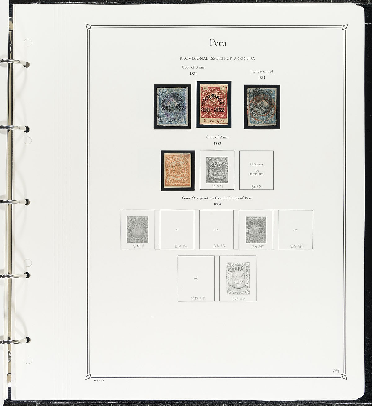 Lovely collection of primarily mint Peru, 1857-1978, containing just over 1,000 stamps, well organized on PALO album pages (in hingeless mounts), in a PALO binder. The collection generally ranges from Scott #3/673, along with a good run of airmail issues, along with postage dues, occupations, provisionals, and other "back of the book" issues. A spot check indicated singles, sets, and partial sets cataloguing $10 to $30 and up, including Scott #s 32-37 (used, $141 total), 234-241 (mh, $59), C81 souvenir sheet (lh, $55), just to name a few. Owner's older Scott catalogue value for the collection totals US$3,096.00 ($4179.60 CDN). A collection that begs to be continued. Estimate =