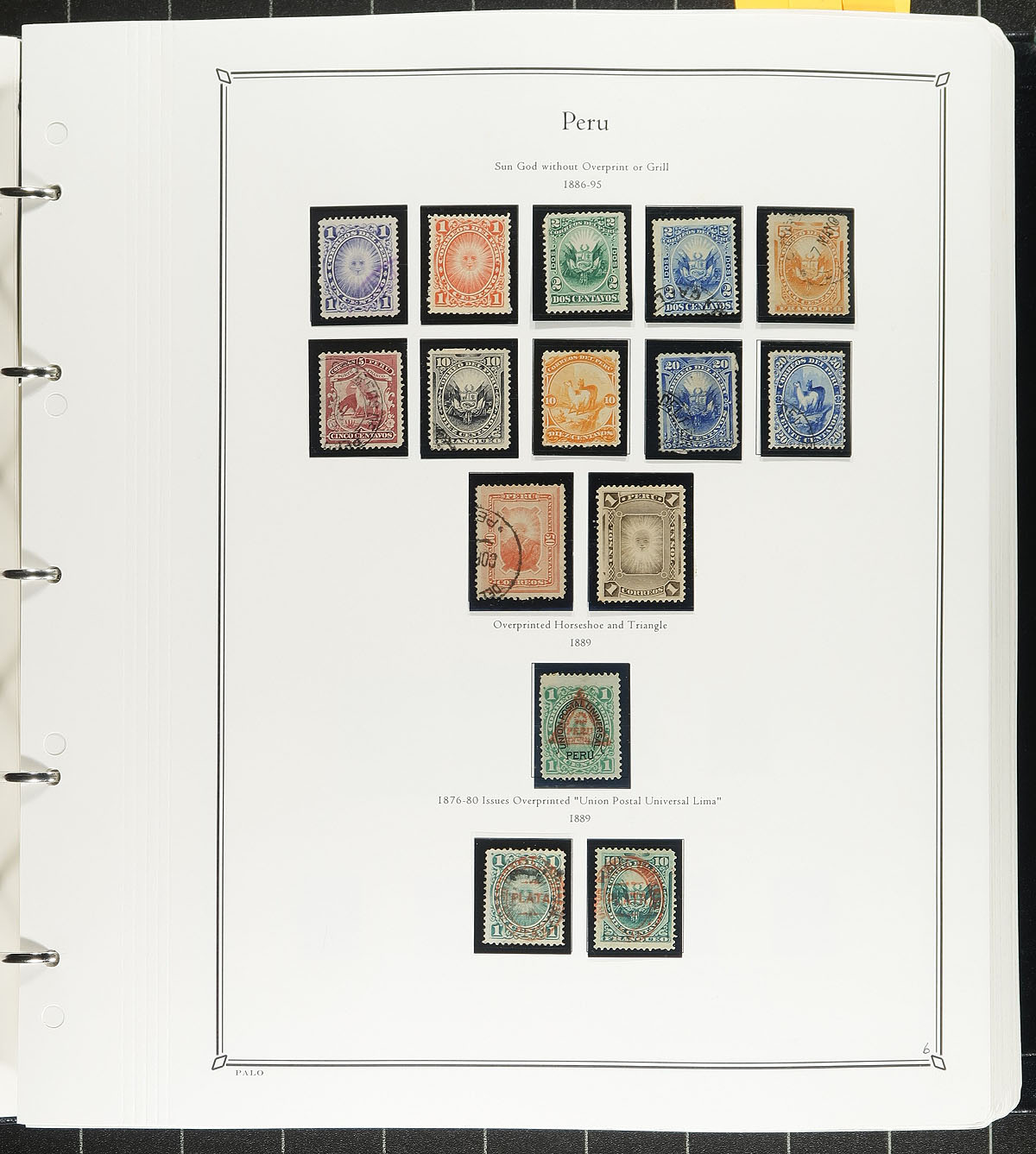 Lovely collection of primarily mint Peru, 1857-1978, containing just over 1,000 stamps, well organized on PALO album pages (in hingeless mounts), in a PALO binder. The collection generally ranges from Scott #3/673, along with a good run of airmail issues, along with postage dues, occupations, provisionals, and other "back of the book" issues. A spot check indicated singles, sets, and partial sets cataloguing $10 to $30 and up, including Scott #s 32-37 (used, $141 total), 234-241 (mh, $59), C81 souvenir sheet (lh, $55), just to name a few. Owner's older Scott catalogue value for the collection totals US$3,096.00 ($4179.60 CDN). A collection that begs to be continued. Estimate =