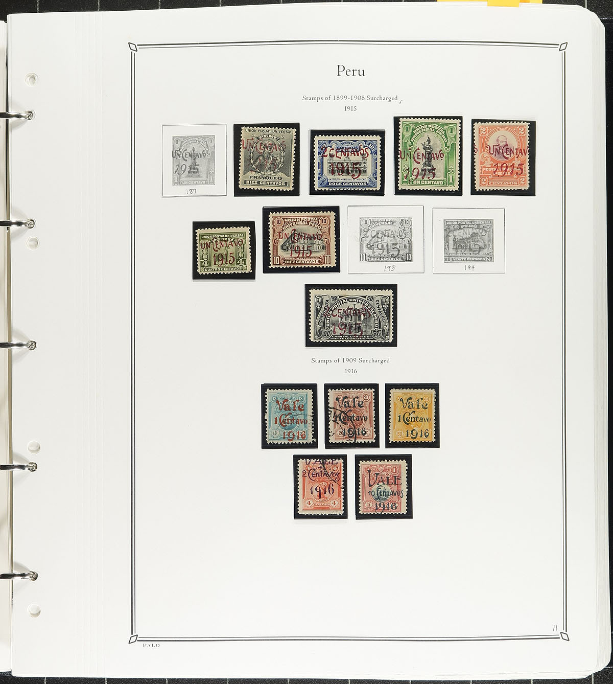 Lovely collection of primarily mint Peru, 1857-1978, containing just over 1,000 stamps, well organized on PALO album pages (in hingeless mounts), in a PALO binder. The collection generally ranges from Scott #3/673, along with a good run of airmail issues, along with postage dues, occupations, provisionals, and other "back of the book" issues. A spot check indicated singles, sets, and partial sets cataloguing $10 to $30 and up, including Scott #s 32-37 (used, $141 total), 234-241 (mh, $59), C81 souvenir sheet (lh, $55), just to name a few. Owner's older Scott catalogue value for the collection totals US$3,096.00 ($4179.60 CDN). A collection that begs to be continued. Estimate =