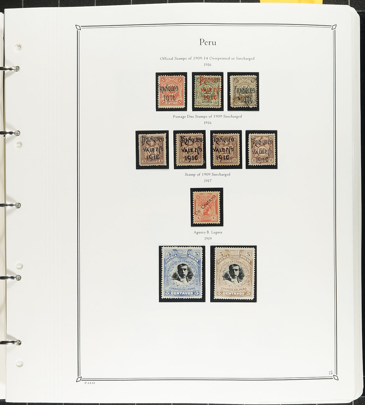 Lovely collection of primarily mint Peru, 1857-1978, containing just over 1,000 stamps, well organized on PALO album pages (in hingeless mounts), in a PALO binder. The collection generally ranges from Scott #3/673, along with a good run of airmail issues, along with postage dues, occupations, provisionals, and other "back of the book" issues. A spot check indicated singles, sets, and partial sets cataloguing $10 to $30 and up, including Scott #s 32-37 (used, $141 total), 234-241 (mh, $59), C81 souvenir sheet (lh, $55), just to name a few. Owner's older Scott catalogue value for the collection totals US$3,096.00 ($4179.60 CDN). A collection that begs to be continued. Estimate =