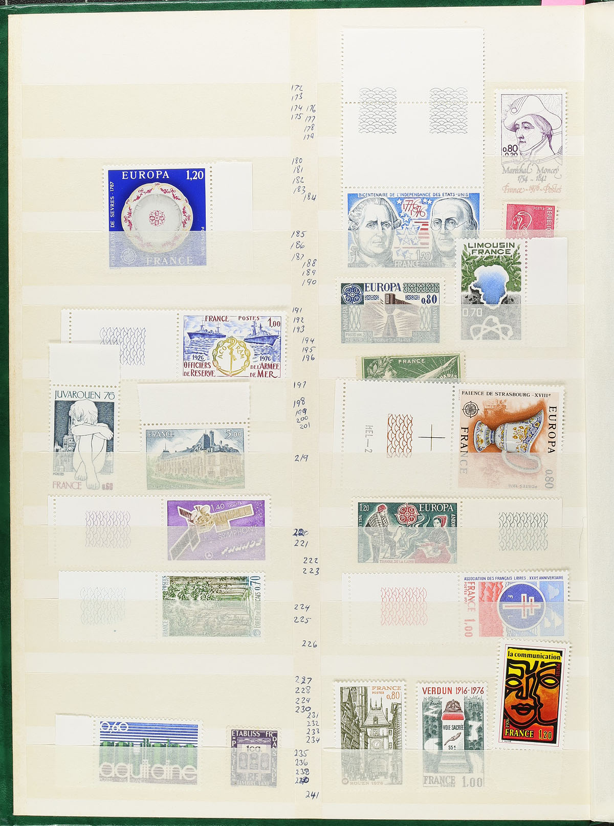 Collection of mint France, 1936-1970, containing roughly 500 different stamps in a fairly well organized stockbook, The collection generally ranges from Scott #311/1279, with some material in beyond the given range, mostly organized by Scott number, with some material still in glassines, or newer purchases misplaced at the front and back of the stockbook. A spot check indicated some singles and sets cataloguing $5 to $15 each, with mostly lightly hinged stamps up to 1960, and mostly never hinged stamps thereafter. A nice stater collection of this popular country. Estimate =