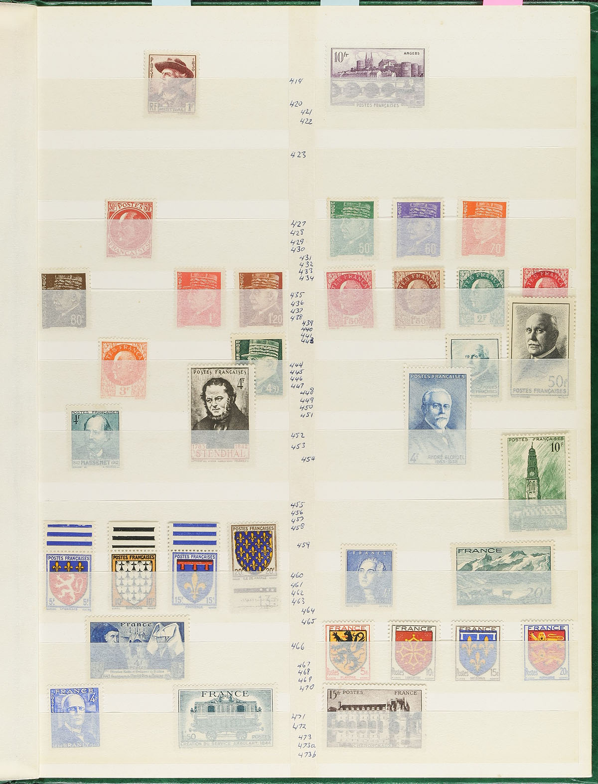 Collection of mint France, 1936-1970, containing roughly 500 different stamps in a fairly well organized stockbook, The collection generally ranges from Scott #311/1279, with some material in beyond the given range, mostly organized by Scott number, with some material still in glassines, or newer purchases misplaced at the front and back of the stockbook. A spot check indicated some singles and sets cataloguing $5 to $15 each, with mostly lightly hinged stamps up to 1960, and mostly never hinged stamps thereafter. A nice stater collection of this popular country. Estimate =